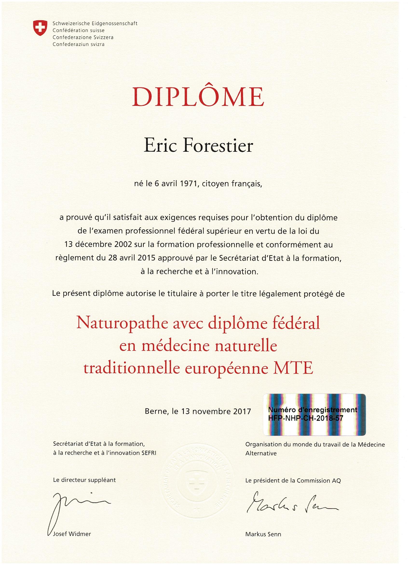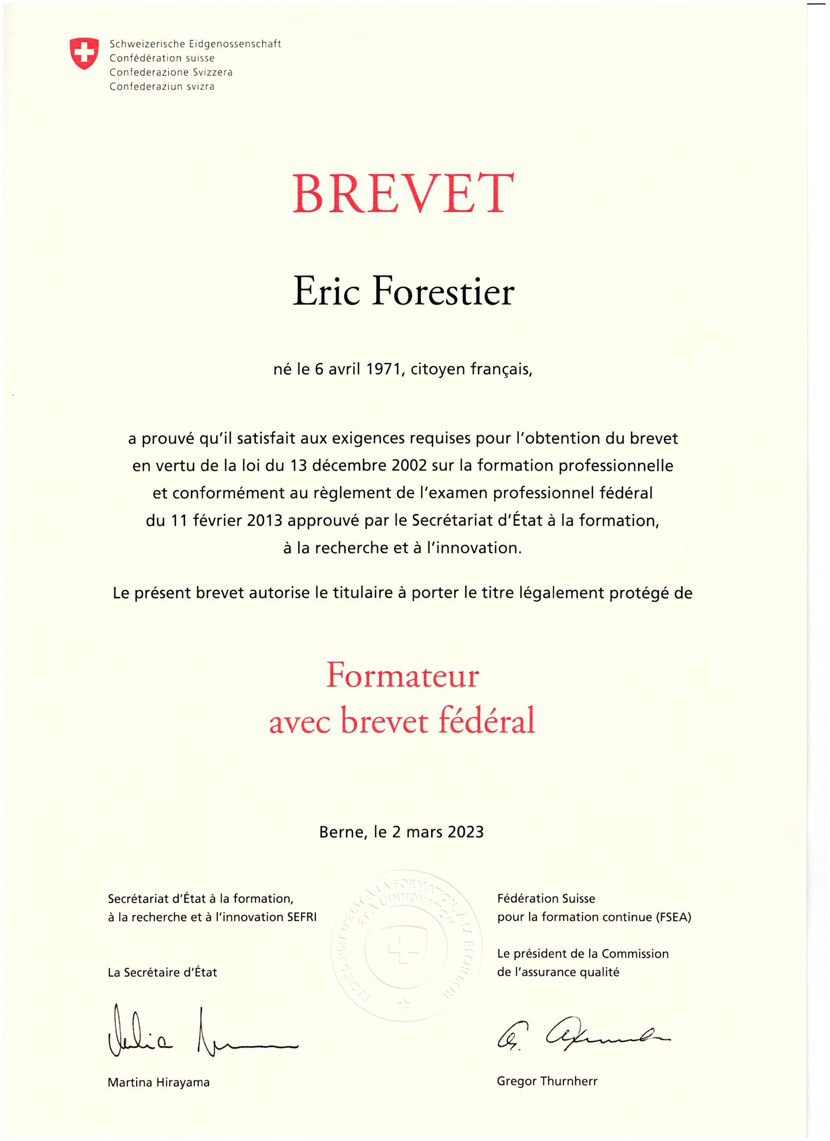 Contact : Eric Forestier au 078 912 34 67 ou par email par le formulaire du site ; Naturopathe avec diplôme fédéral en MTE (ICI le diplôme), Formateur d'adultes avec Brevet fédéral (ICI le brevet). Consultez ICI l'accréditation comme Mentor OrTra MA (OdA AM)